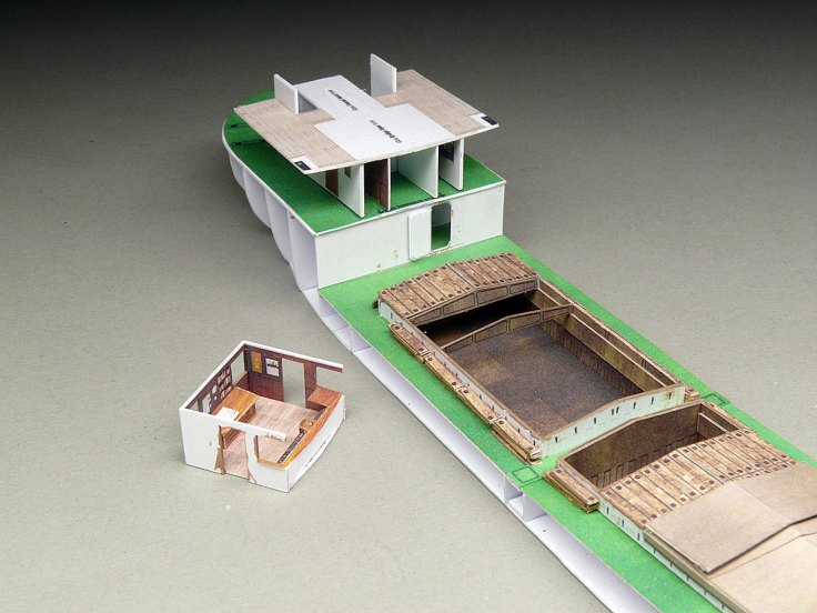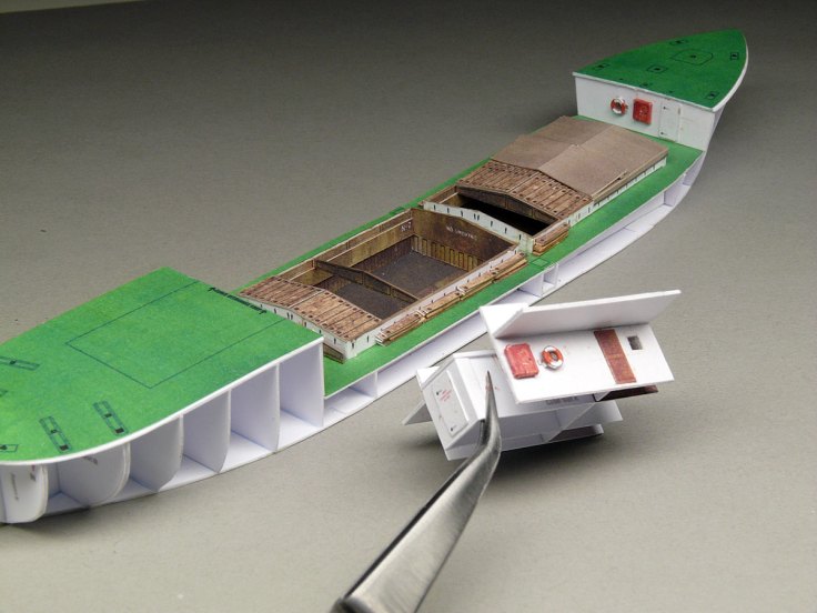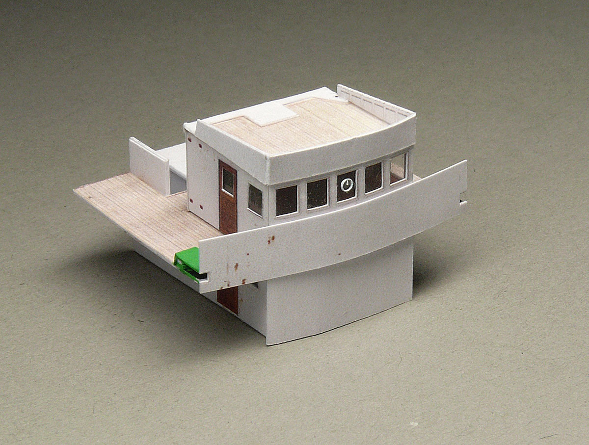 in der letzten Woche habe ich mich dann mit dem weiteren Aufbau des Kümos befasst; das Decksgrün – nachdem ich es etwas dunkler ausgedruckt – empfinde ich maßstäblich als erträglich; wenn man einmal herausgefunden, wie der Konstrukteur „tickt“, geht es dann auch gut mit dem Zusammenbau voran. Alles sehr stabil und vor allem, es paßt! Aus dem Architekturprogramm dieses Verlages kenne ich es ja schon – es wird sehr viel umwickelt. Wo ich einen Kasten gezeichnet, gerillt und stumpf verklebt, wird hier ein – oft aus mehreren gedoppelten Schichten – Unterbau angefertigt, der dann mit dem eigentlich bedruckten Teil umwickelt, bzw. eingewickelt wird. Der Schlauchkasten neben dem Rettungsring ist so ein Vertreter …