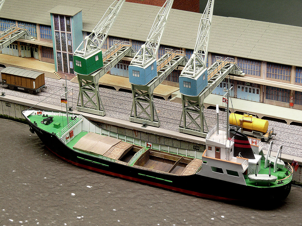Seit ein paar Monaten liegen ein paar Hafenteile bei mir herum; an anderer Stelle wird ja schon fleißig an verschieden Hafenprojekten gearbeitet – ich hatte mich ja auch schon mal mit diesem Thema befaßt; was bot sich da besser an, als den Kümo in diese Umgebung einzubetten – ein bißchen Atmosphäre aus der Zeit der Kräne …