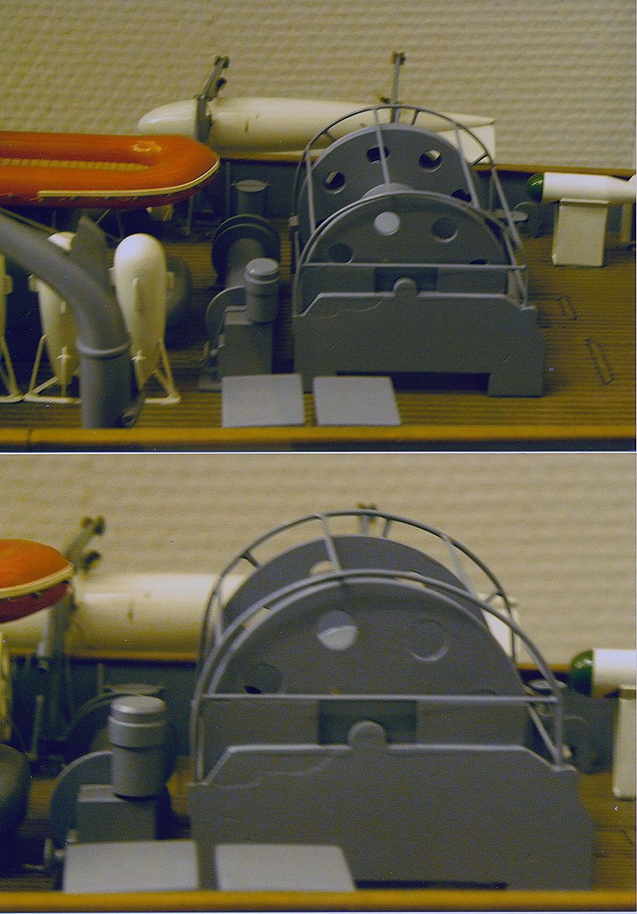 Durch die Hilfe von Peter Hurler gelang ich an ein paar Fotos von der großen Räumwinde. Sie entstanden an einem Modell im Wehrgeschichtlichen Museum in Koblenz.Es ist ja nicht so, daß nicht genug Fotos für diese Minensucher zur Verfügung stehen; aber genau diese Winde ist jedesmal von einer Persenning verdeckt, wenn sich die Schiffe im Hafen befanden, bzw. bei der Aus- und Einreise von einer Übung. Und obwohl bei der Marine eigentlich alles genormt sein sollte – diese Winden sind nicht unbedingt in Form und Aussehen der Standard gewesen. Also scheidet Übernahme von anderen Einheiten aus.