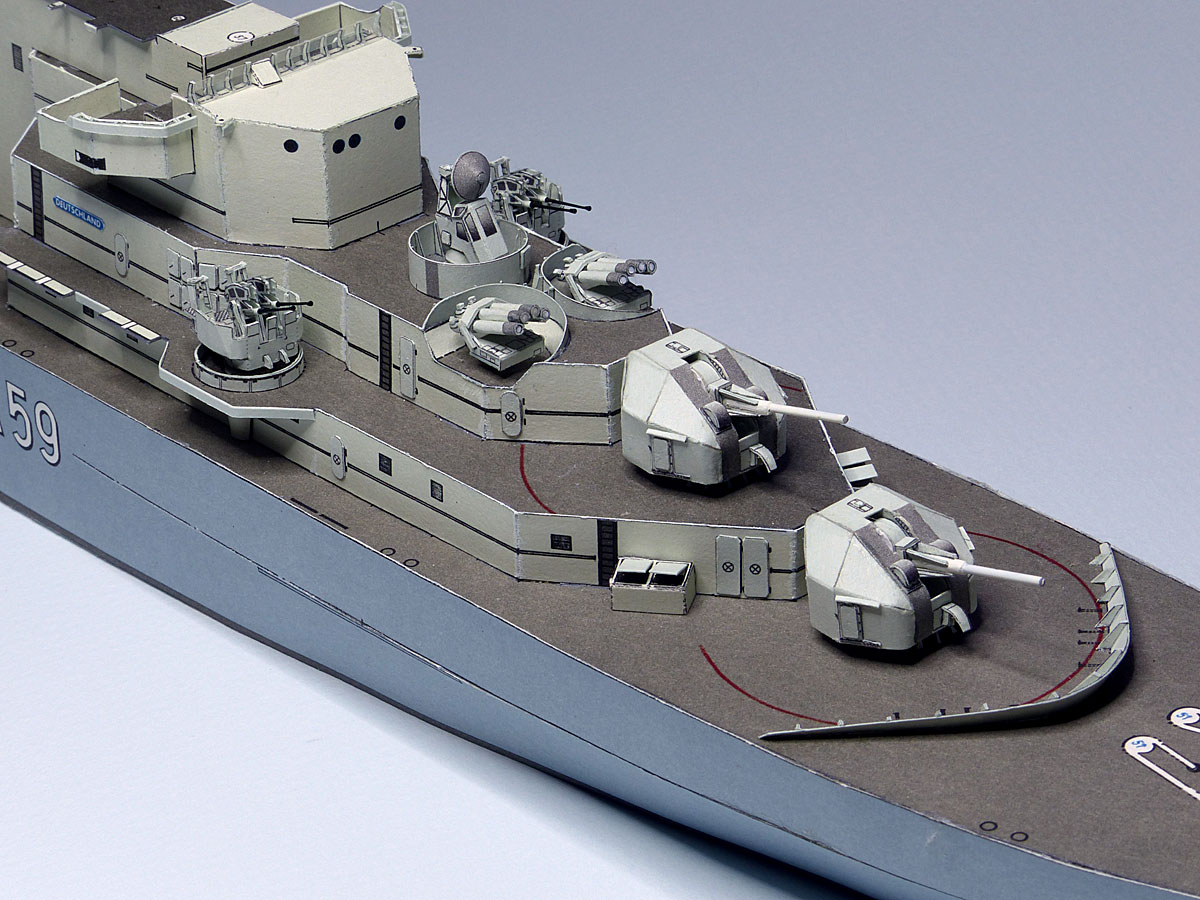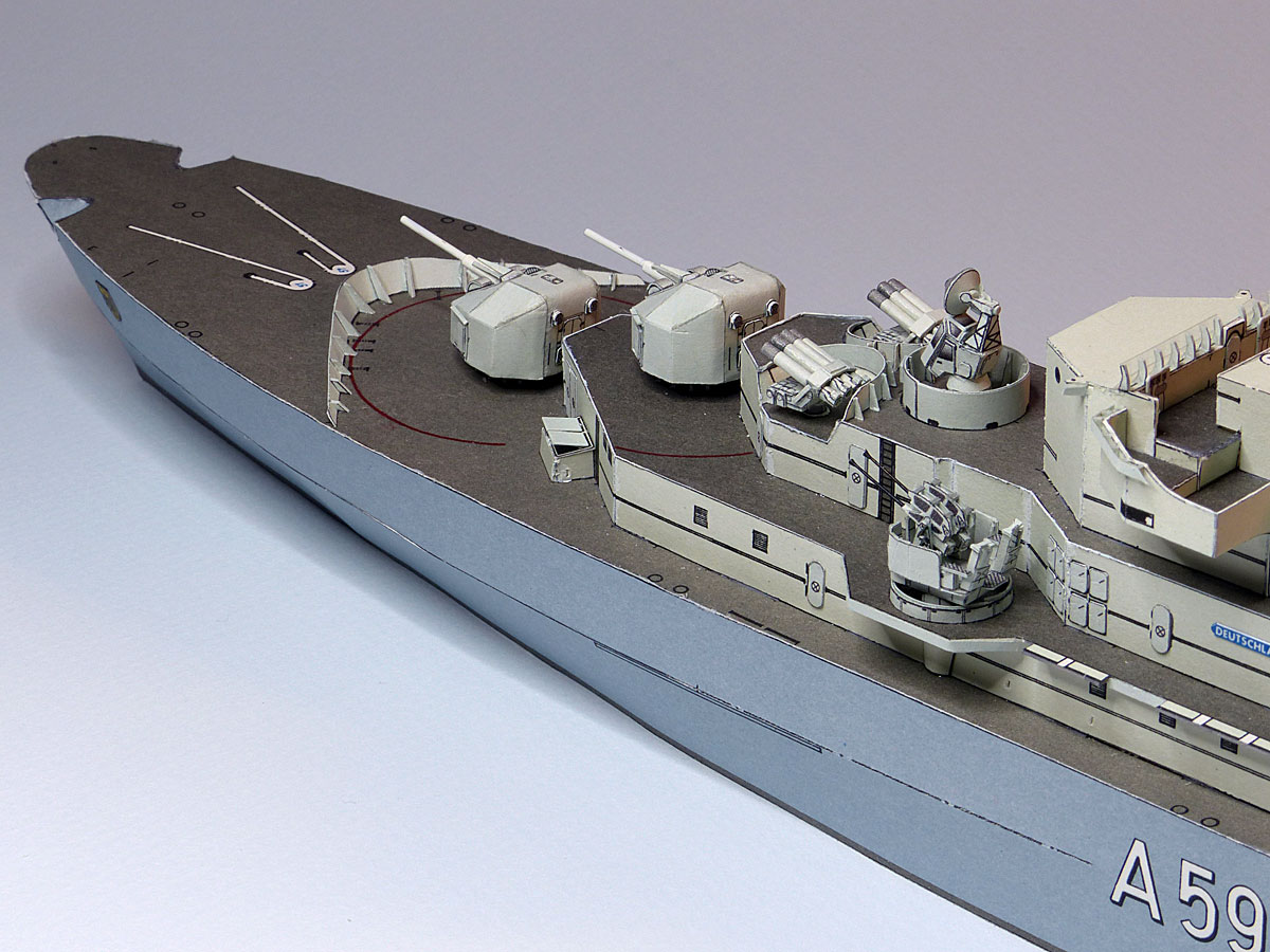 Seit dem Erscheinen des Wilhelmshavener Modells sind mehr als 50 Jahre vergangen. Und damals gestaltete man eben so. Ich habe versucht – mit meinen heutigen Möglichkeiten – das Original noch einmal einzufangen und in Kombination mit dem Wilhelmshavener Modell zu bringen. Durch einen glücklichen Zufall erwarb ich vor einigen Jahren einen Packen 160-g-Papier der Marke Continental-LX der Firma Igepa Plus im Farbton Grau 90. Im direkten, planen Vergleich zum Grau des Offsetdrucks, erscheint er nicht unbedingt stimmig. Dieses ändert sich aber, wenn man die Bauteile in die 3.Dimension erhebt …