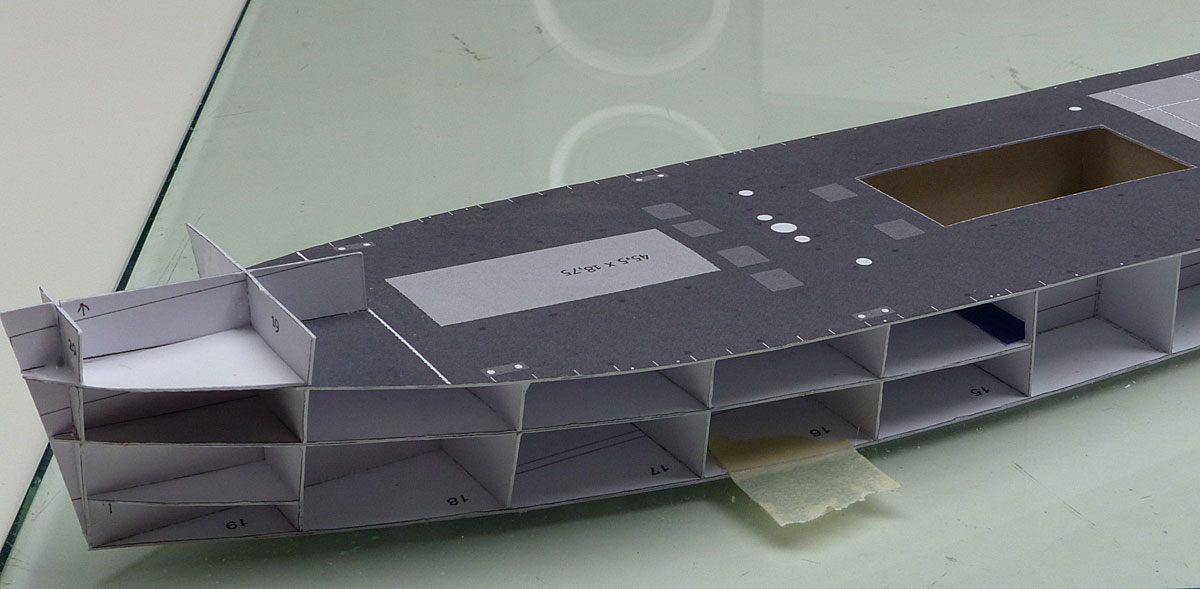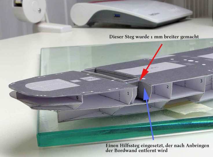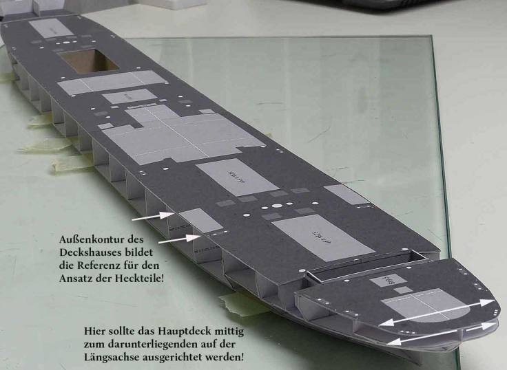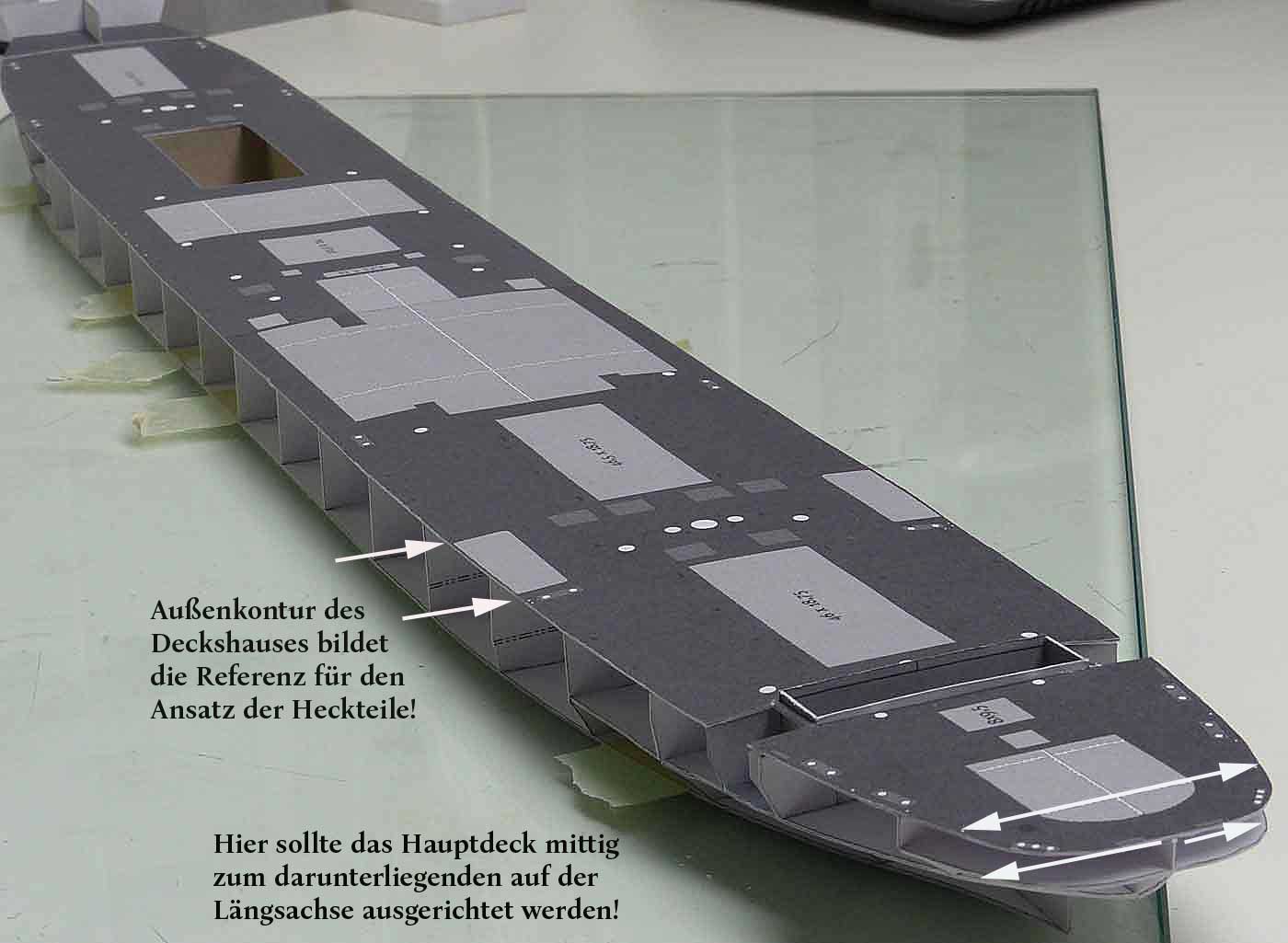 Das Auflegen eines Decks zum ersten Mal nach der Zeichnung und Ausdrucken ist immer ein spannender Moment; zumal es sich hier um einen Flatschen von 52 Zentimetern bei einer Breite von 7 cm handelt … ich hatte ihn aber so geteilt, daß er noch für mich auf eine DIN A4-Seite paßt.