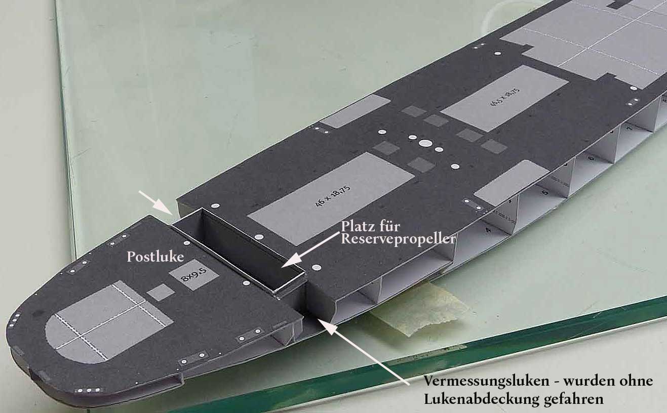 Es begnete mir zum ersten Mal, daß die beiden Vermessungsluken offen gefahren wurden; die Luke in der Mitte – mit Lukendeckeln verschlossen – staut an Steuerbord den Reservepropeller; auf entsprechenden Traversen die Ladewinde mittschiffs für die Postluke sowie an Backbord die Ankerwinde für den Heckanker.