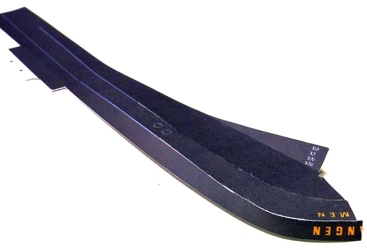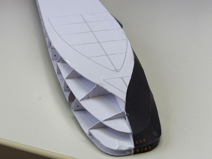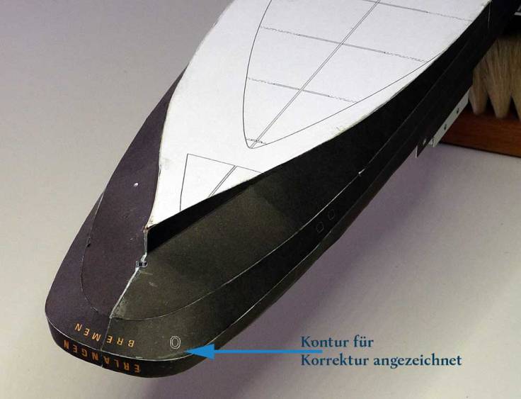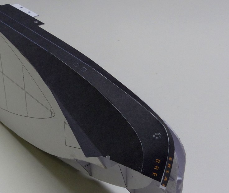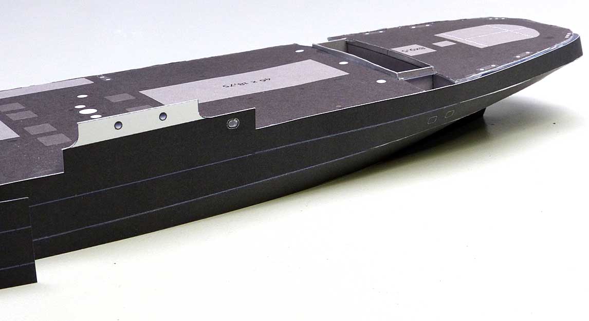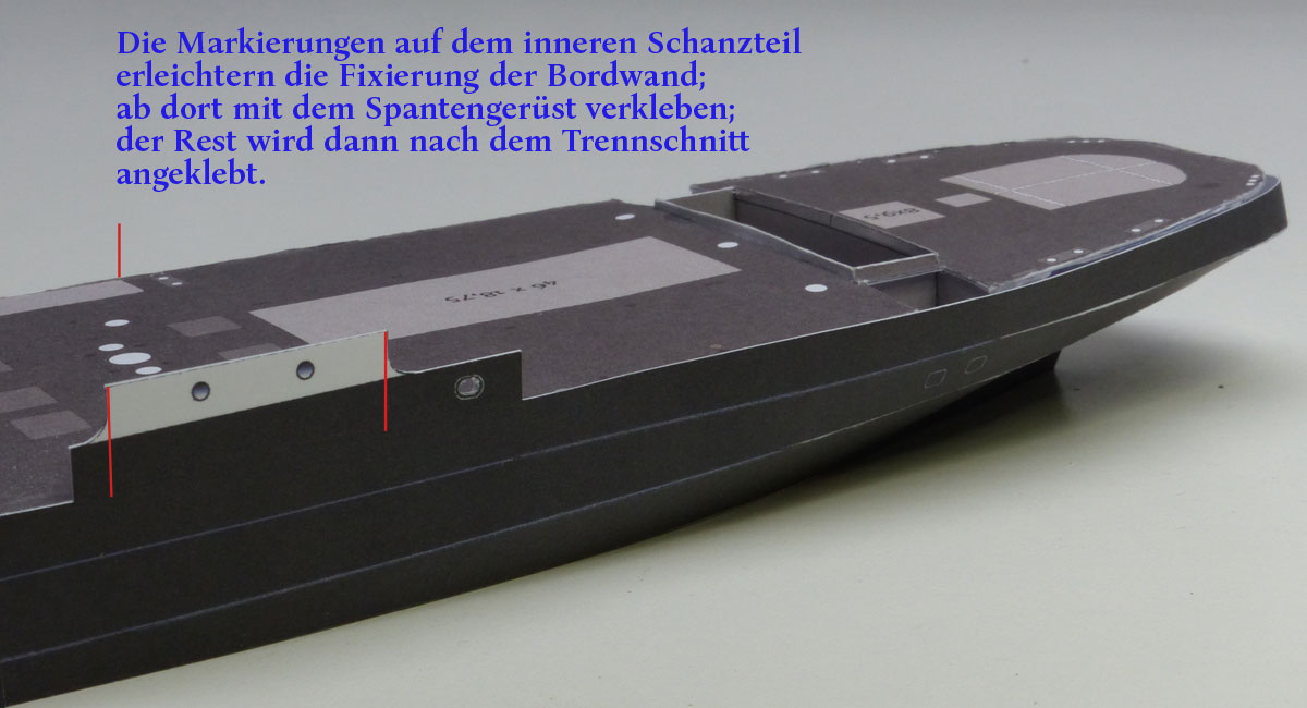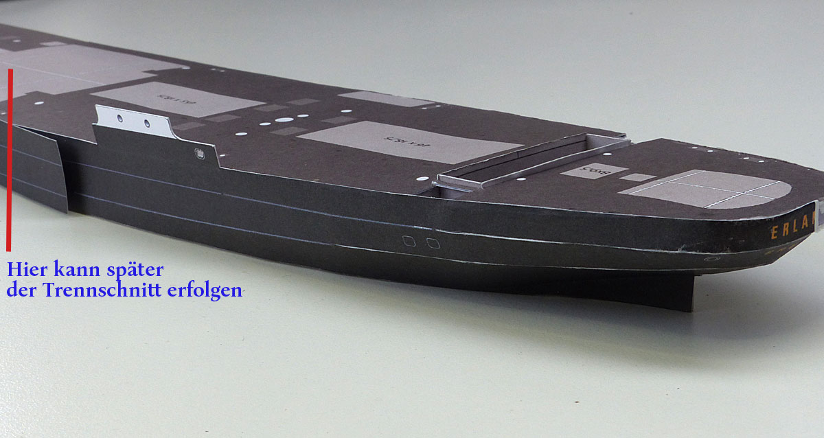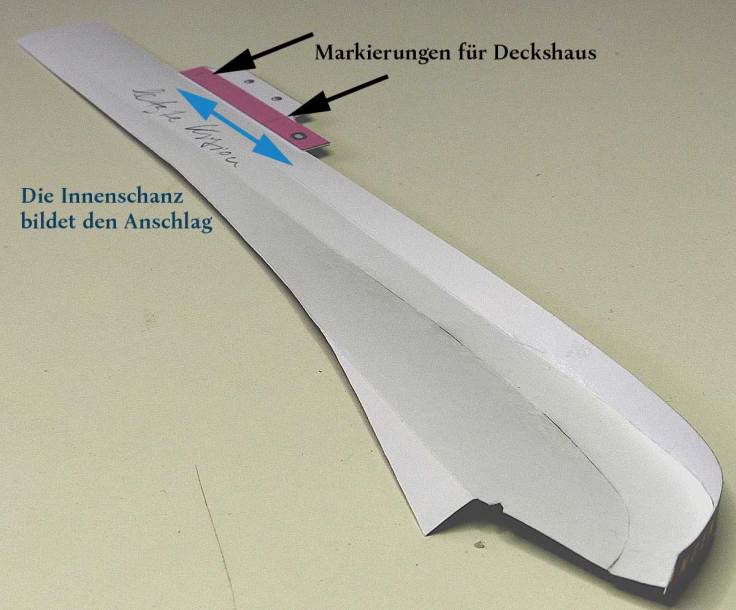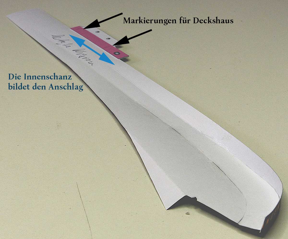 Anschließend wird der durch die Pfeile gekennzeichnete Bereich am Rumpf verklebt und der Rest in homöopathischen Schritten Richtung Heck angeklebt. Der Teil vor dem Deckshaus wird nicht mit dem Rumpf verbunden – es folgt später ein Trennschnitt in Verbindung mit dem Mittelteil….