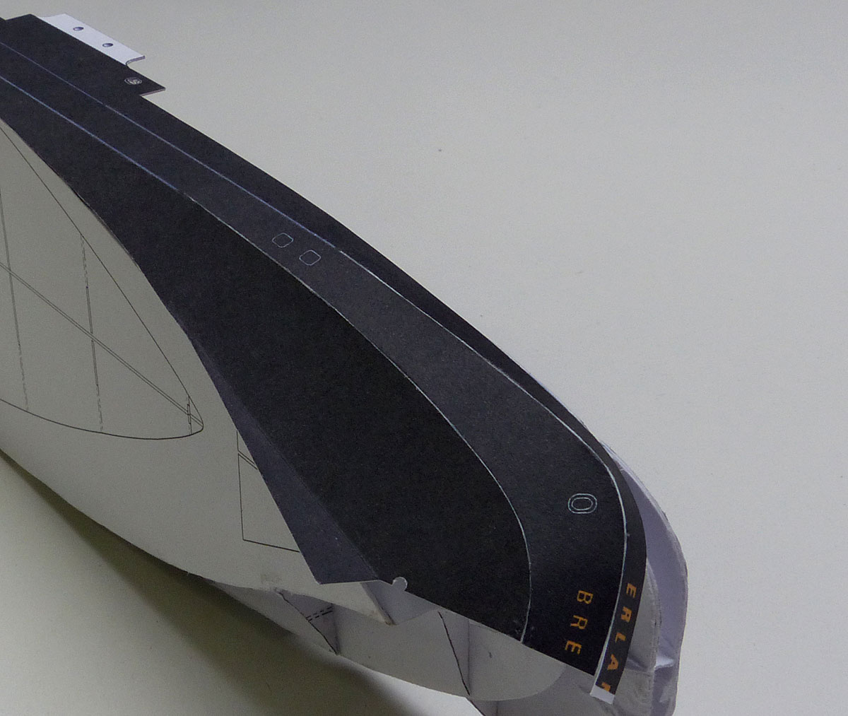 Ich habe hier ein wenig gegen das Material, sprich Laufrichtung des Kartons, arbeiten müssen; sonst hätte ich mir im Bereich der Vermessungsluken eine Beule eingefangen.