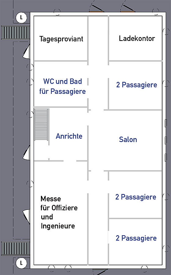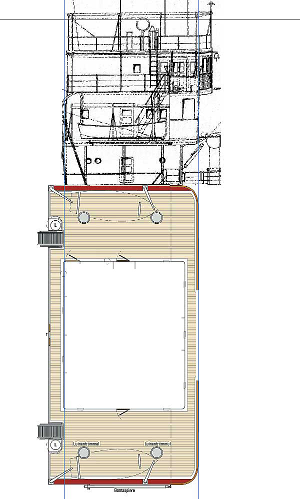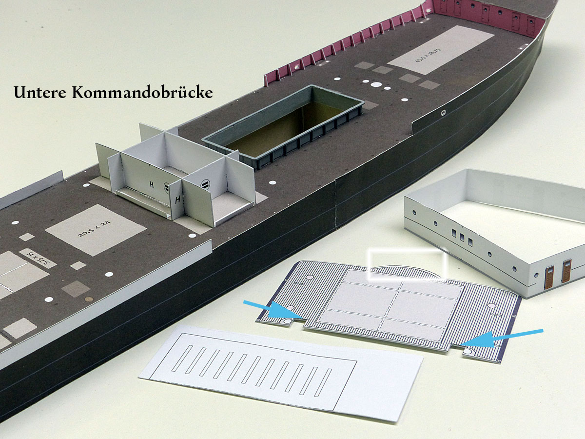 Der Aufbau gestattet sich simpel – nur beim Deck ist etwas Sorgfalt angebracht; die Ausschnitte für die beiden Niedergänge sollten bündig mit der Achterkante der Aufbauwand sein und mittig zum Schiffsrumpf. Was aber kein Problem darstellt, ist doch die Decksbreite mit der Schiffsbreite an dieser Stelle identisch.