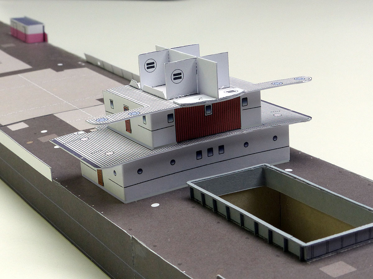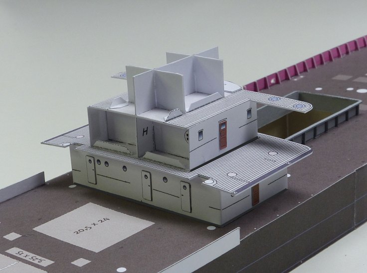 Hier ist bereits das Deck der Oberen Kommandobrücke angebracht und deren Spanten für den Aufbau.