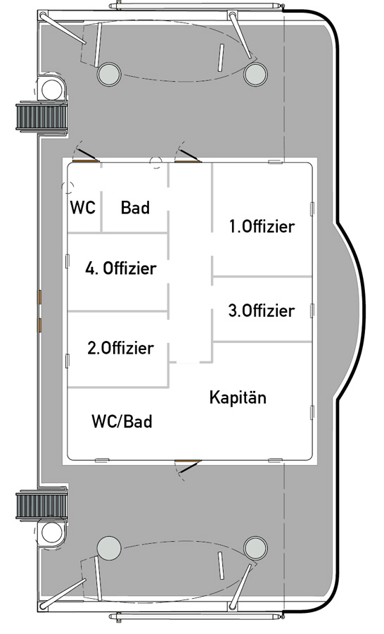 Als nächstes ist das Deck für die untere Kommandobrücke an der Reihe; wenn man sich den Plan ein wenig genauer ansieht, fällt folgendes auf. Der Kaptein hat seinen eigenen Zugang plus Bad und WC – Master next God. Die Herren Offiziere teilen sich einen Zugang von Deck her sowie Bad und WC.