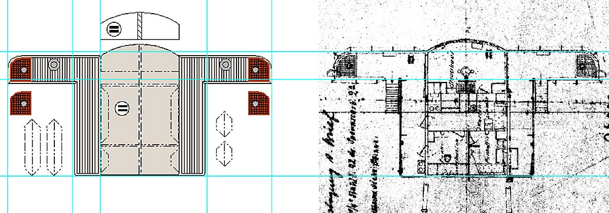 Anschließend noch ein wenig Kosmetik bei der Anordnung von Schotten und Außenöffnungen – Bulleys und Anverwandte – mußte sein.