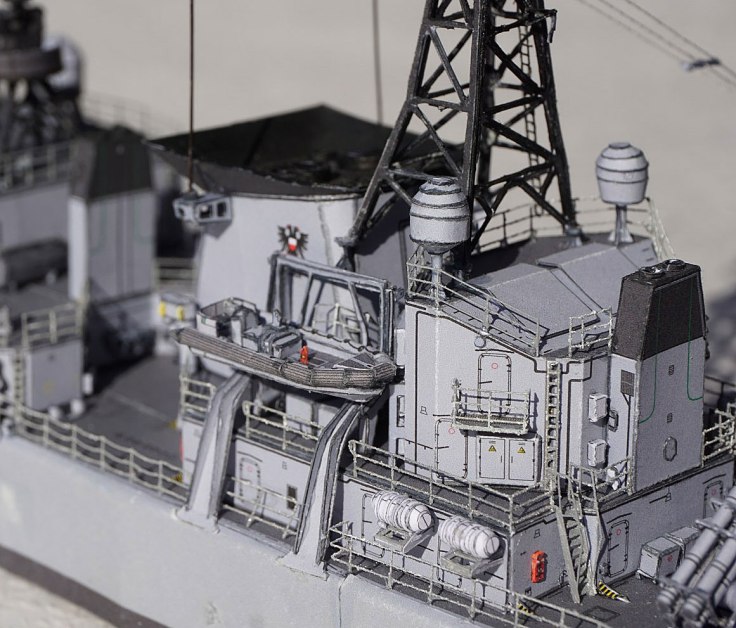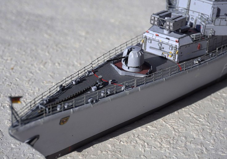Ab und an möchte ich hier auch gebaute Schiffsmodelle, die nicht aus meiner Feder stammen, vorstellen. In diesem Falle die Fregatte LÜBECK, gebaut von Günter Schreyer aus dem Modellbaubogen, den Andreas Jacobsen gestaltet hat und der hier – nebst Ätzsatz – erhältlich ist https://jabietz.de/shop/produkt/fregatte-klasse-122-luebeck/.