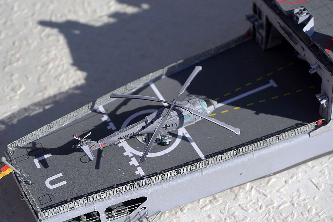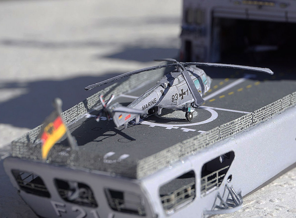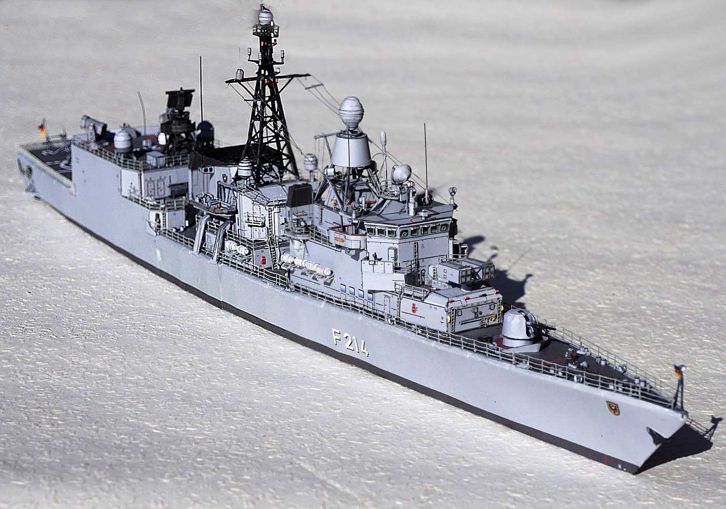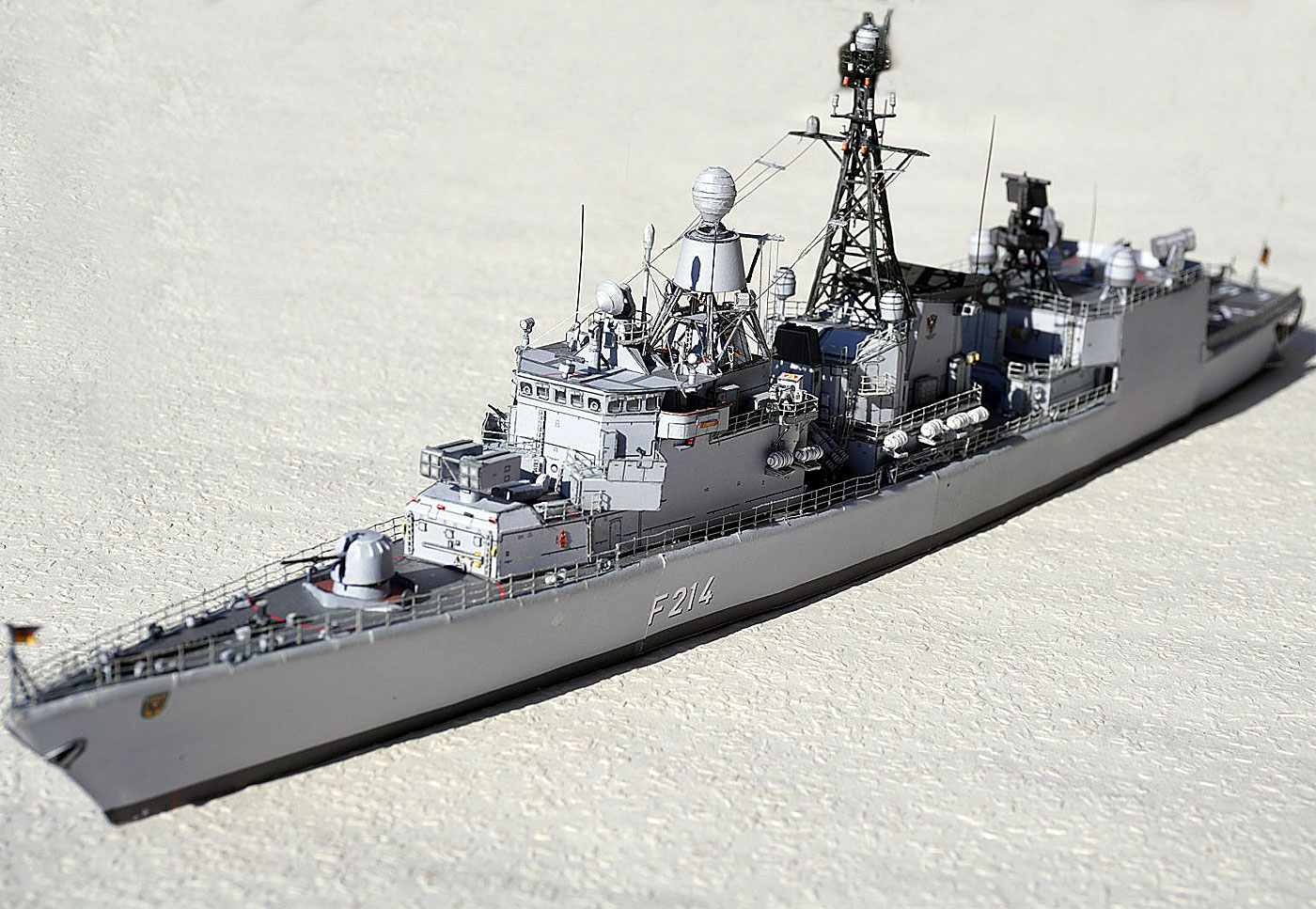 Ab und an möchte ich hier auch gebaute Schiffsmodelle, die nicht aus meiner Feder stammen, vorstellen. In diesem Falle die Fregatte LÜBECK, gebaut von Günter Schreyer aus dem Modellbaubogen, den Andreas Jacobsen gestaltet hat und der hier – nebst Ätzsatz – erhältlich ist https://jabietz.de/shop/produkt/fregatte-klasse-122-luebeck/.