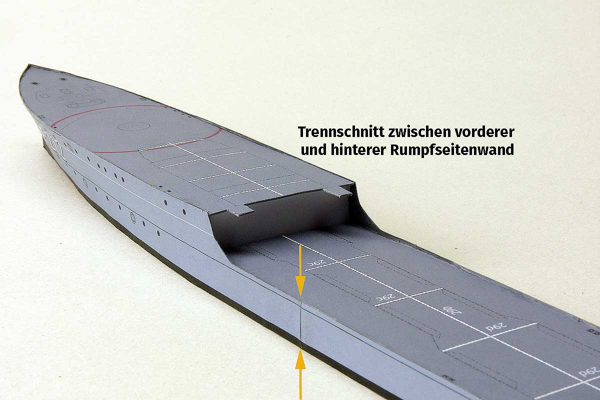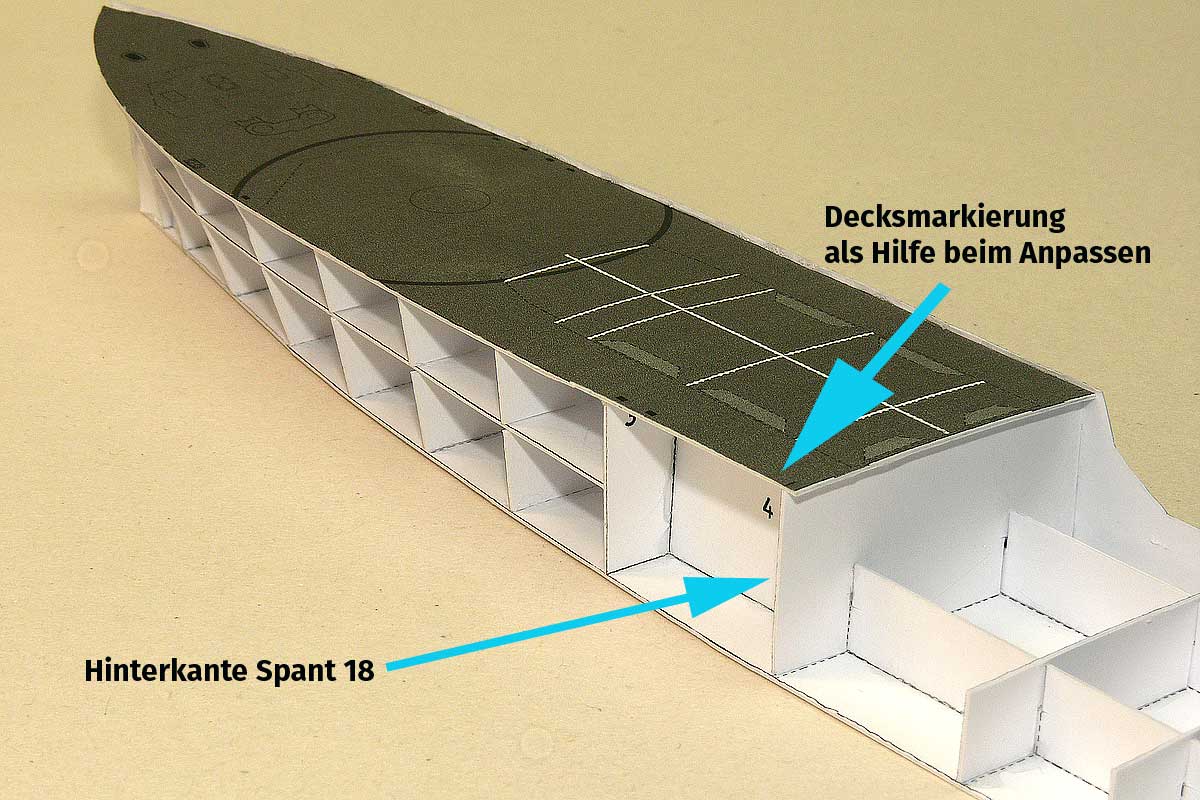 Anschliessend die Rumpfhälften des Hauptdecks – von hinten mittig auf dem Längsspant beginnend nach vorn am Spantgerüst verkleben. Die Teile der vorderen und der hinteren Bordwand haben Überstand .. der Trennsschnitte sollte jedoch nicht genau auf einem Querspant erfolgen!