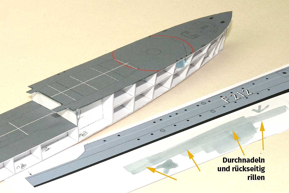 Auf der unteren Linie des Plattenganges habe ich ein paar Referenzpunkte gesetzt; diese bitte durchstechen und von der Rückseite rillen und leicht konkav formen; den unteren Bereich entsprechend ausrunden und dann – Markierung Deck/Bordwand – im Bereich von 10 vor und 20 mm hinter der Markierung – am Spantengerüst verkleben. Dann in kleinen homöopathischen Abständen nach vorn hin – an der Grundplatte unten orientierend – nach vor „abarbeiten“ …