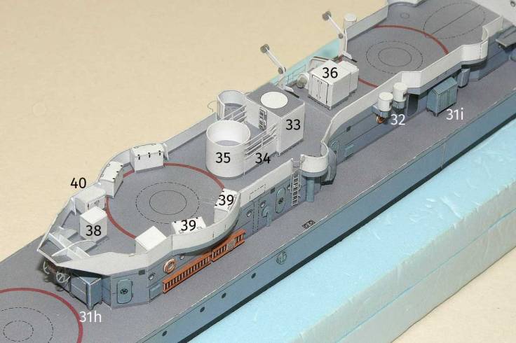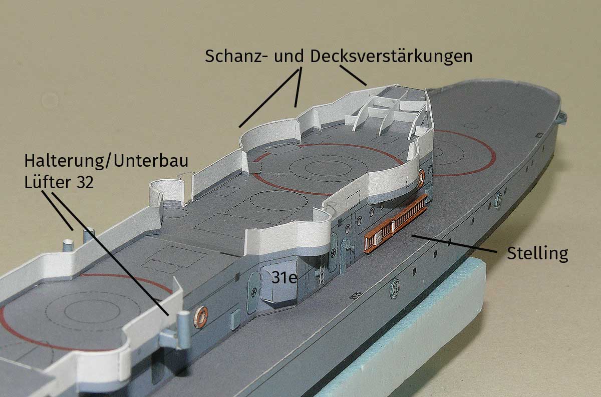 Im nächsten Schritt können die Lüfter aussen an der festen Reling; einige Spinde auf dem Hauptdeck, Stelling, Kabel-/Seiltrommel angebracht werden. Auf Deck 31c selbst finden die Spinde, Kästen und Aufbauten ihren Platz. Auch Relings und Steigleitern sollten jetzt schon verarbeitet werden.