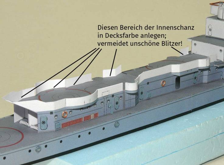 Hier noch einmal der Hinweis – auch wenn auf dem Foto explizit dargestellt: Innenschanzteile der Aufbauwände und Ergänzungen – in Höhe des Decks grau anlegen.
