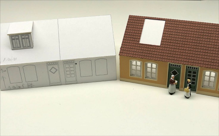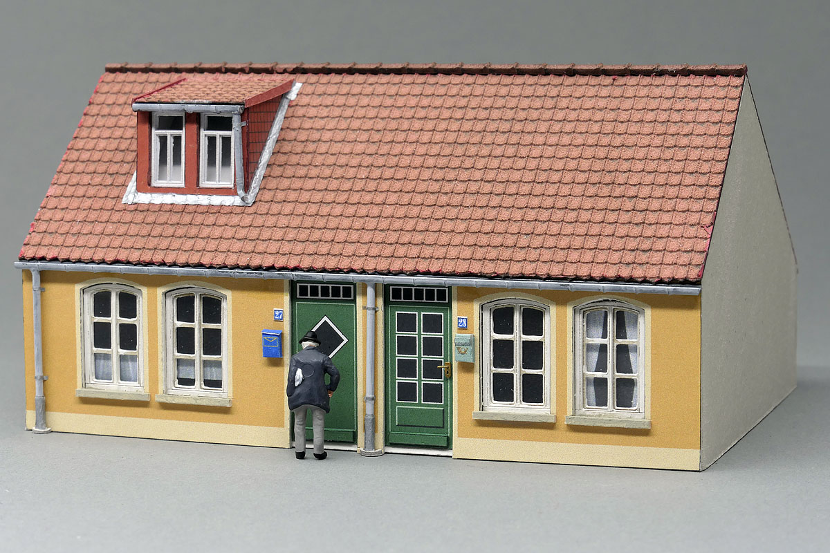 Bis auf die Regenrinnen und die Fallrohre alles aus Karton; und – er hat mir sehr viel Spaß gemacht – mein Ausflug in die Architektur aus Karton und den Maßstab 1:87 und eigentlich sollte auch Schluß sein; aber neue Fotos, die ich fand, erfordern eine Fortsetzung; schließlich ist die zweite Reihe nicht die schlechteste – geringer Platzbedarf und vieeeeeeele Möglichkeiten der Ausgestaltung.