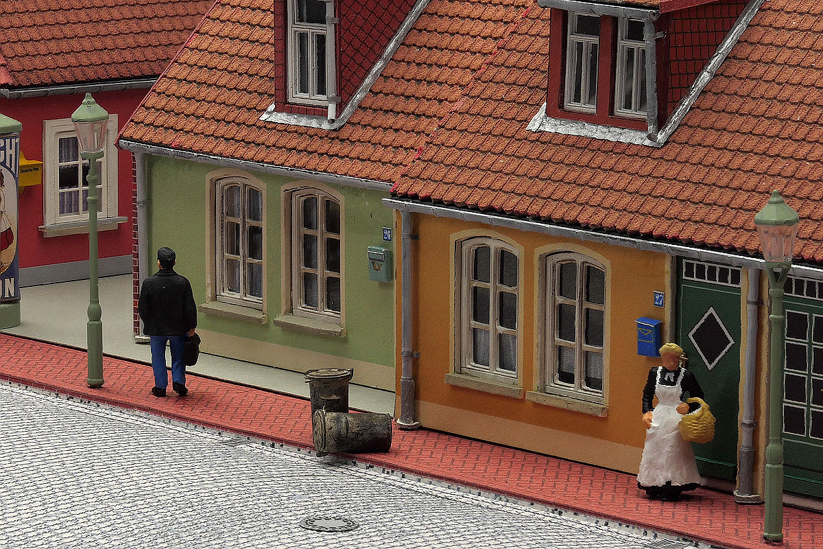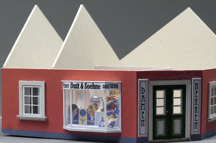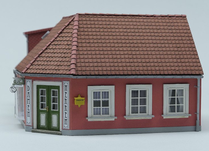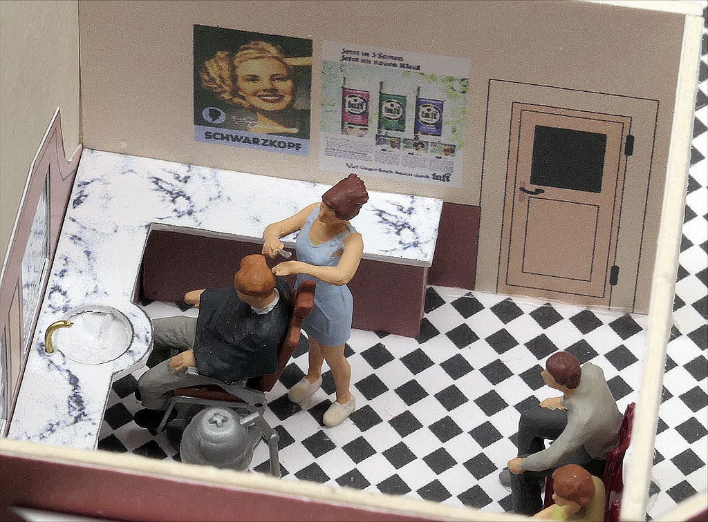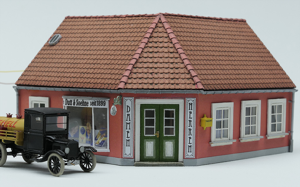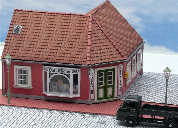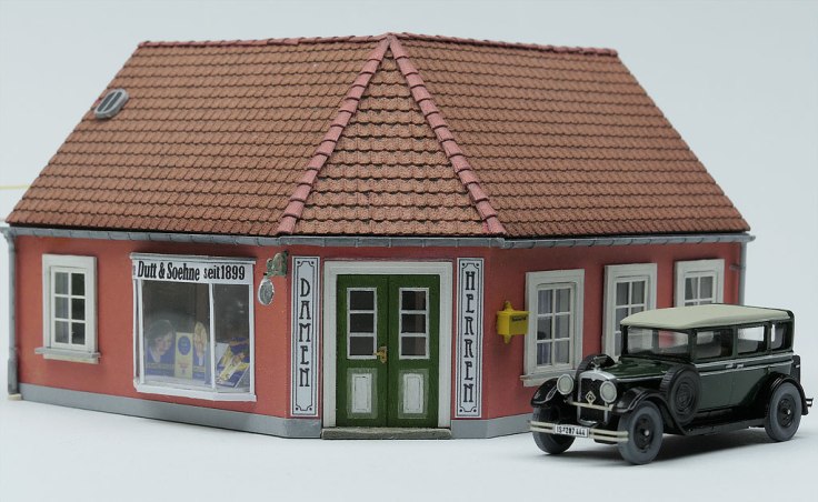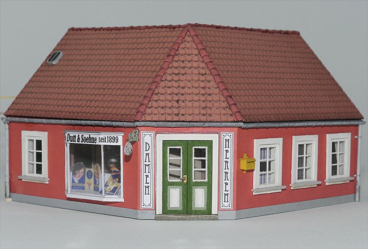 Animiert von Fotos aus Dänemark, aber auch aus einigen Teilen Norddeutschlands — der Holm in Schleswig oder die hintere Reihe in Husum — um nur ein paar Beispiele zu nennen, wollte ich auch ein Eckhaus; bei einer Figurenbestellung sah ich Zubehör für einen Frisiersalon.