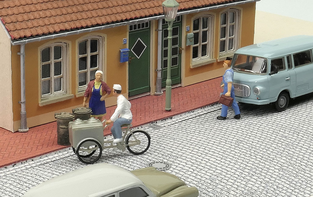 Das gleiche Motiv, aus einem anderen Blickwinkel; und Björn, die Mülltonnen stehen lotrecht! Zum Thema Personen in einem Diorama oder in einer Szene, sollten wenn es die Situation und Darstellung erlaubt, eine Beziehung zueinander aufbauen … ich glaube Frau Konopke und Gino demonstrieren es hier gerade und der Blick des Technikers sagt auch einiges zum Thema, erst macht sie meinen Besuch eilig und nun quatscht sie sich hier einen Wolf mit dem Eisheini … oder so