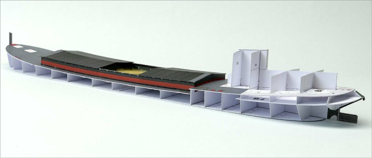 Die Maschinenraumoberlichter, die drei roten Klappen vor dem Steuerhaus, habe ich aus Tonpapier neu gefertigt und geöffnet dargestellt; war im Original meist auch so und bringt ein bißchen Leben in die ganze Geschichte.