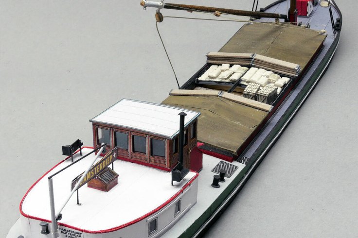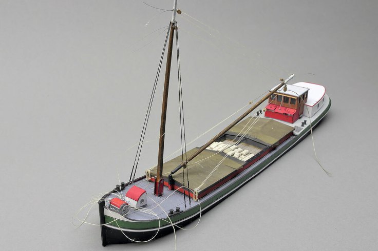 Ich habe in den letzten Tagen das Binnenschiff weitgehend fertiggestellt; die Namensschilder neu, ebenso wie Anker, Positionslaternen, Achterlicht und den kleinen Kran am Heck des Schiffes. Er diente der Aufnahme eines kleiinen Ruderbootes; ich habe ihn drehbar gelagert, weil ich noch nicht weiß, ob ich das Boot als „Anhängsel“, wie man es oft sehen kann oder gelagert darstelle.