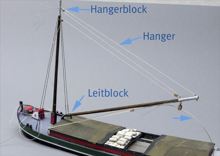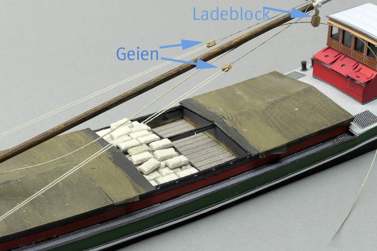 Die Geien, die Taue, die dafür sorgen dass der Ladebaum in seiner Richtiung verändert, und dann in der bleibt, habe ich so belassen; ich hätte mir sonst Teile der Persenning zerlegt; Und, wie ich auf Fotos feststellen konnte, sie wurden an verschiedenen Orten im Bereich des Laderaums angeschlagen; immer nach den Erfordernissen, der Ladung, die es zu übernehmen oder zu löschen/abzuliefern, galt.