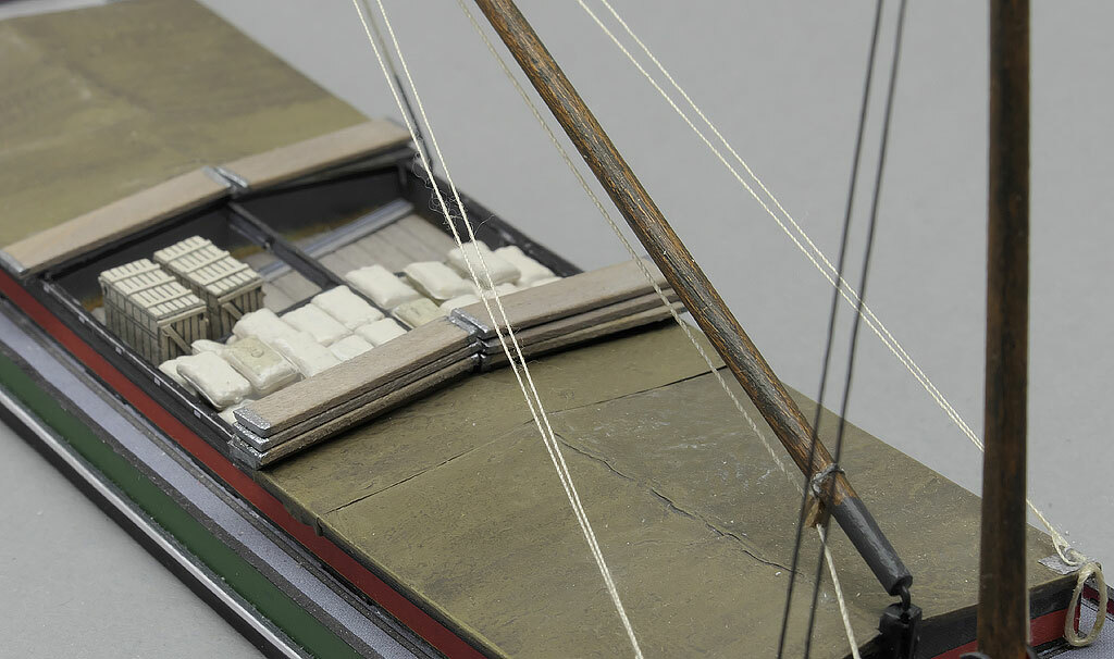 Die Geien, die Taue, die dafür sorgen dass der Ladebaum in seiner Richtiung verändert, und dann in der bleibt, habe ich so belassen; ich hätte mir sonst Teile der Persenning zerlegt; Und, wie ich auf Fotos feststellen konnte, sie wurden an verschiedenen Orten im Bereich des Laderaums angeschlagen; immer nach den Erfordernissen, der Ladung, die es zu übernehmen oder zu löschen/abzuliefern, galt.