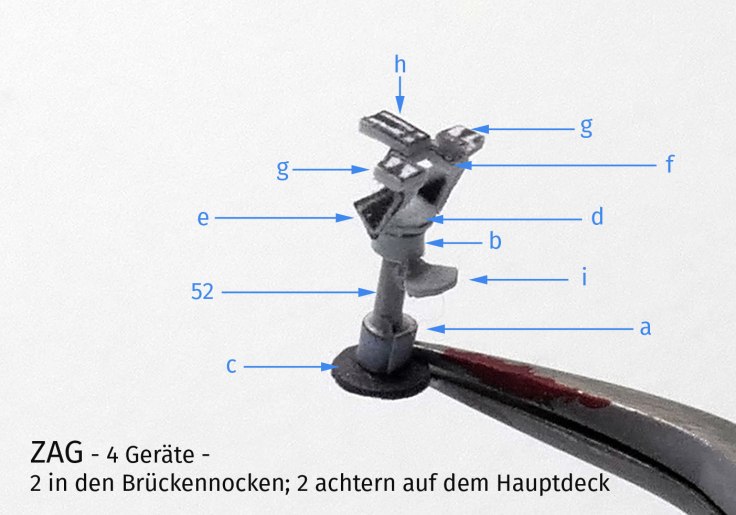 Etwas fieseliger gestaltet sich der Bau der 4 ZAGs, Zielanweiser, die opto-mechanisch bedient wurden und natürlich auf einer Schulfregatte nicht fehlen dürfen. Auch hier habe ich ein Foto erstellt und wenn man in Reihenfolge des Alphabets vorgeht, gibt es keine Schwierigkeiten; alternativ gibt es ein Ätzteil für filigran affine Modellbauer.