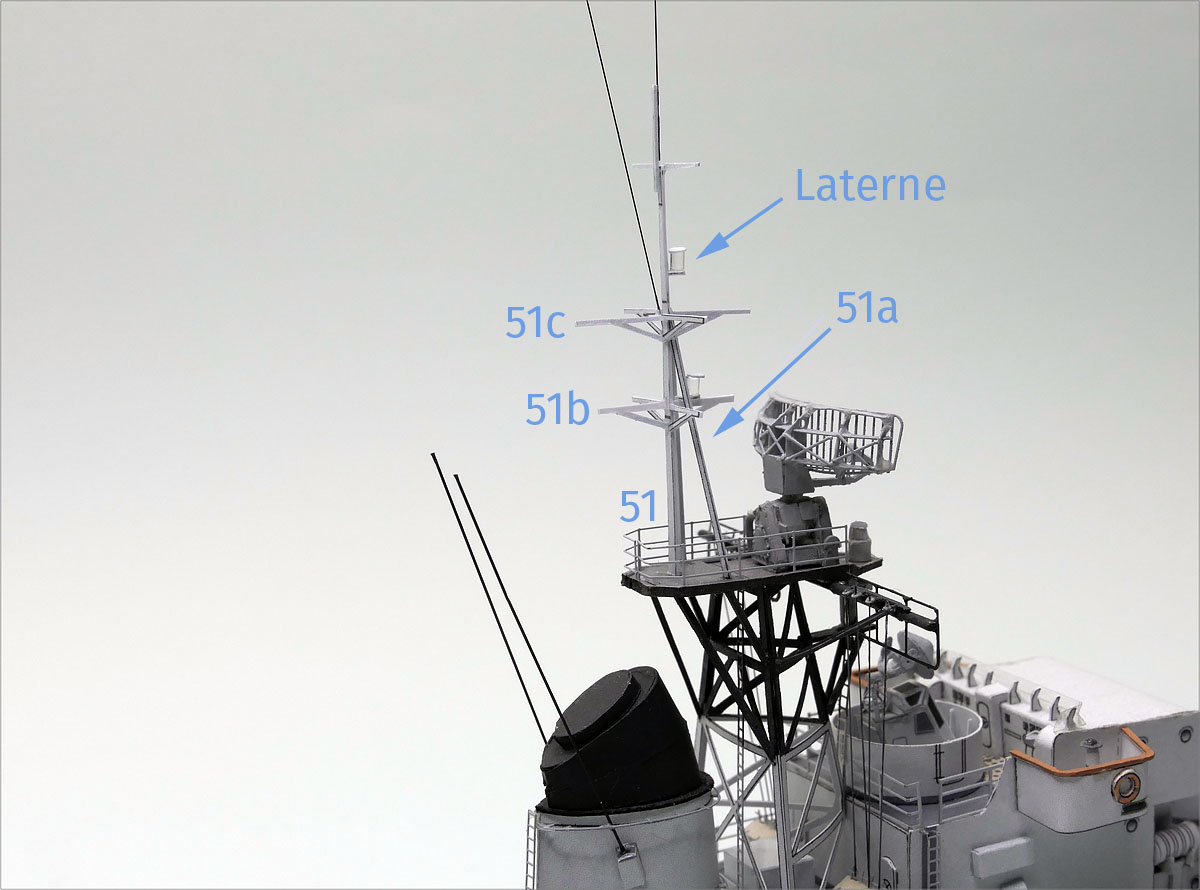 Der Achtermast – vor dem Aufbau des Contraves-Gerätes – angebracht, ist auf obigem Bild gut zu erkennen; auf See wird dort, u.a. die Seeflagge gehißt an der schrägen Gaffel.